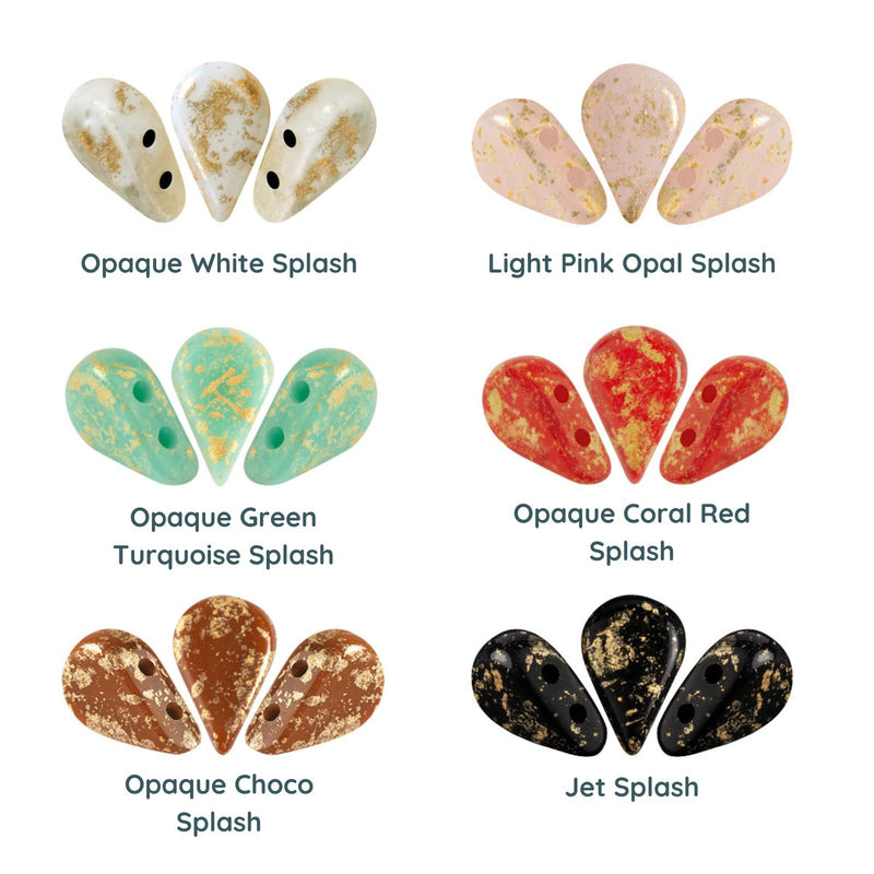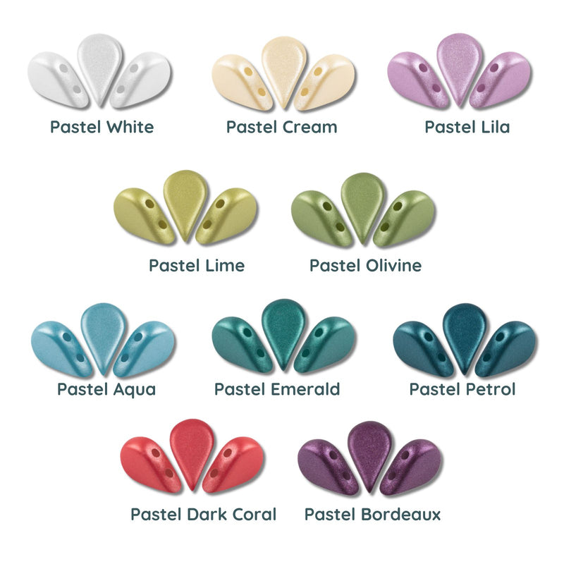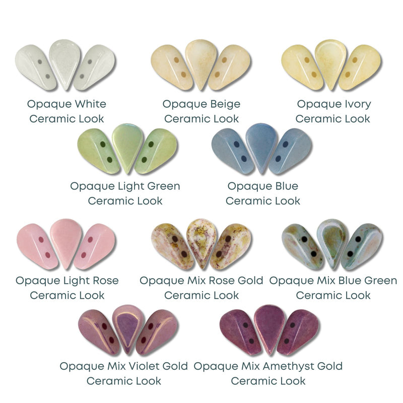 Color chart of tear-shaped beads in Stone, Canary Yellow, Peach, Indian Rose, Rose Nude, Hibiscus, Light Terracotta, Terracotta, Green Garden, Grey Medium, and Celestial Blue