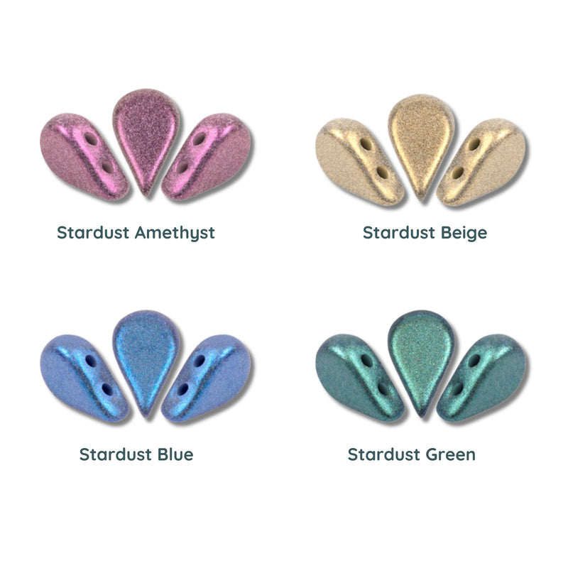 Color variants of Constellation glittered teardrop beads including White, Beige, Gray, Persan Rose, Dark Magenta, Purple Rain, Garnet, Night Blue, Green, and Black