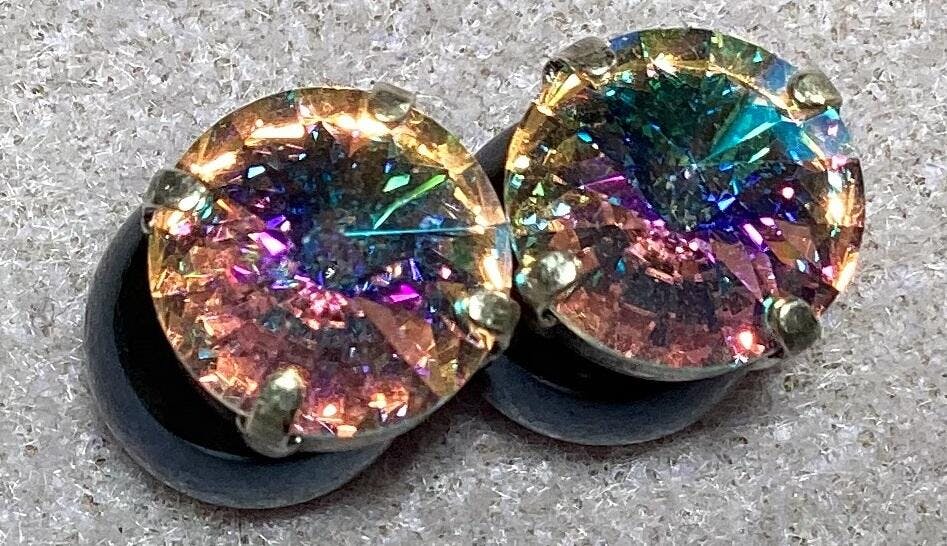 Brilliance Crystal Rivoli #1122 round 12mm. Made by Swarovski in Austria. Glacier Blue is a custom coating by the world's leader in crystal coating, E.H. Ashley. It imparts a delightful soft blue tone to many base colors like Crystal and White Opal and also standard colors such as Aquamarine and Light Siam. Custom coating gives you a completely unique look. Let your work stand out!